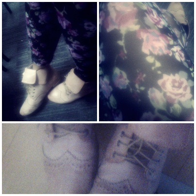 Yesterday I invested in two new pairs of pants, of the more basic persuasion. I found a simple pair of black skinny pants, but with super awesome but subdued leatherette detail running down the outer legs, and patched into the inside of the knees, like riding pants. Yup, pretty basic. I also love the men’s section and found a comfy pair of dark jeans, 50% off! (These purchases mean no more shopping till November, at least!) And here’s a new pair of boots I scored with a pair of gift certificates that I was given. (Couldn’t resist wearing my funky and bright flowery tights today! My idea of toning down my outfits??) Glad to have another pair of shoes that allows for hours of painless walking, and even dancing too, if necessary! 😉